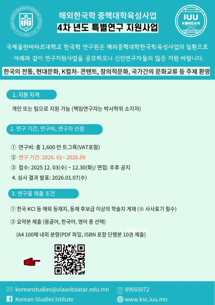 국제울란바타르대학교(IUU) 한국학연구소는 “해외 한국학 중핵대학 육성사업”의 일환으로 한국학 연구를 장려하고 신진 연구자들의 저술 활동을 지원하기 위해 아래와 같이 2025-2026년도 특별연구 지원자를 공모합니다.