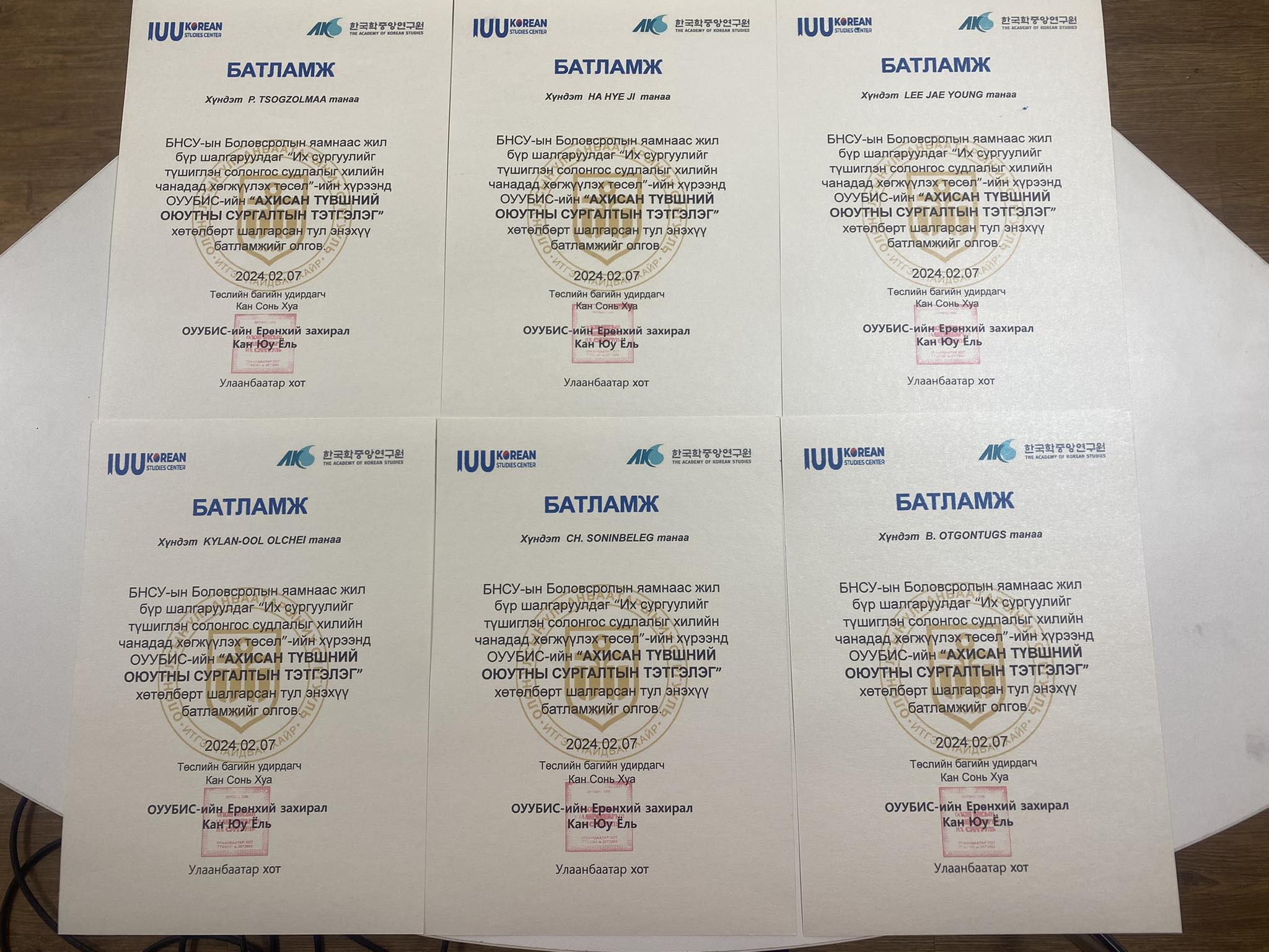 국제울란바타르대학교는 2024년 4월 2일(화)에 2023-2024학년도 2학기 대학원생 대상 장학금 수여식을 가졌습니다.해외 한국학 중핵대학 육성사업 일환으로 한국학 전공 6명의 대학원생들에게 장학증서를 수여하였습니다.